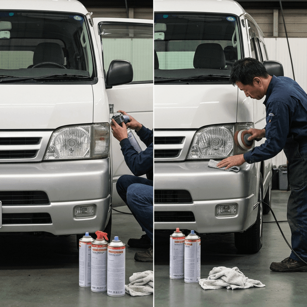 ライトエースバンはヘッドライトの黄ばみとボディの鉄粉が第一印象を損ねます。研磨+鉄粉除去クリーナー+ワックスで輝きを取り戻せば「程度良好」と判断され+4~7万円の効果。