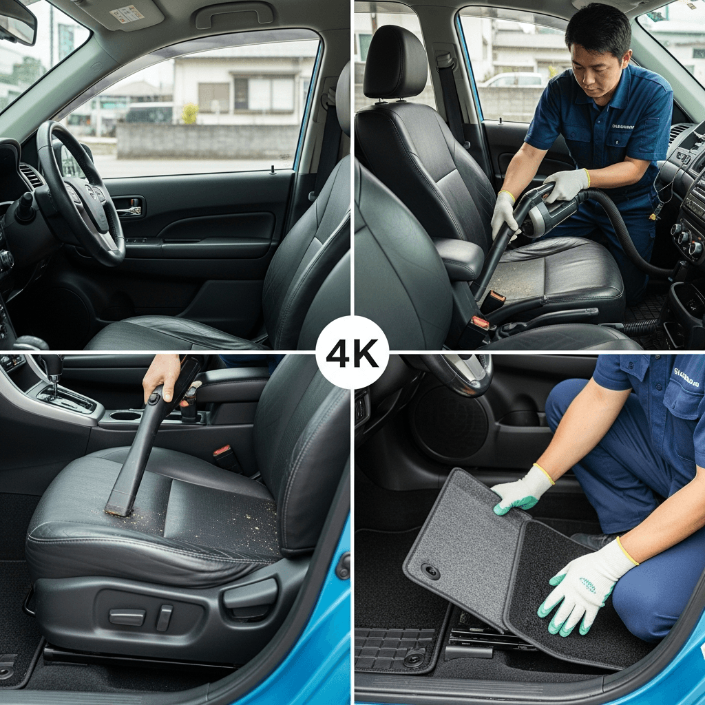 ロゴは第一印象が査定の8割を決めます。シート隙間のゴミ除去、マット洗浄、樹脂パーツ艶出しで新車級の清潔感に。特に臭いゼロなら「禁煙車」扱いで+5~8万円UP。