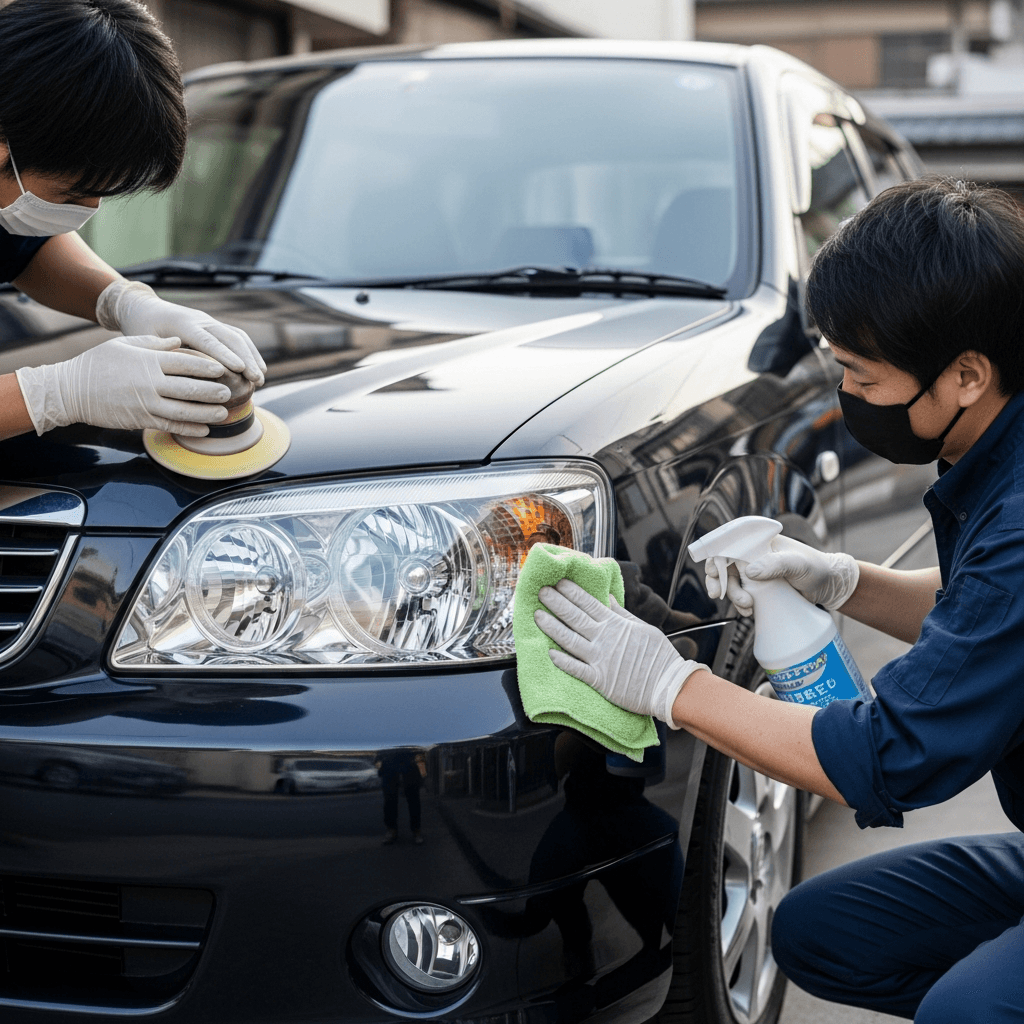 ロゴはヘッドライトの黄ばみとボディの鉄粉が第一印象を損ねます。研磨+鉄粉除去クリーナー+ワックスで輝きを取り戻せば「程度良好」と判断され+4~7万円の効果。