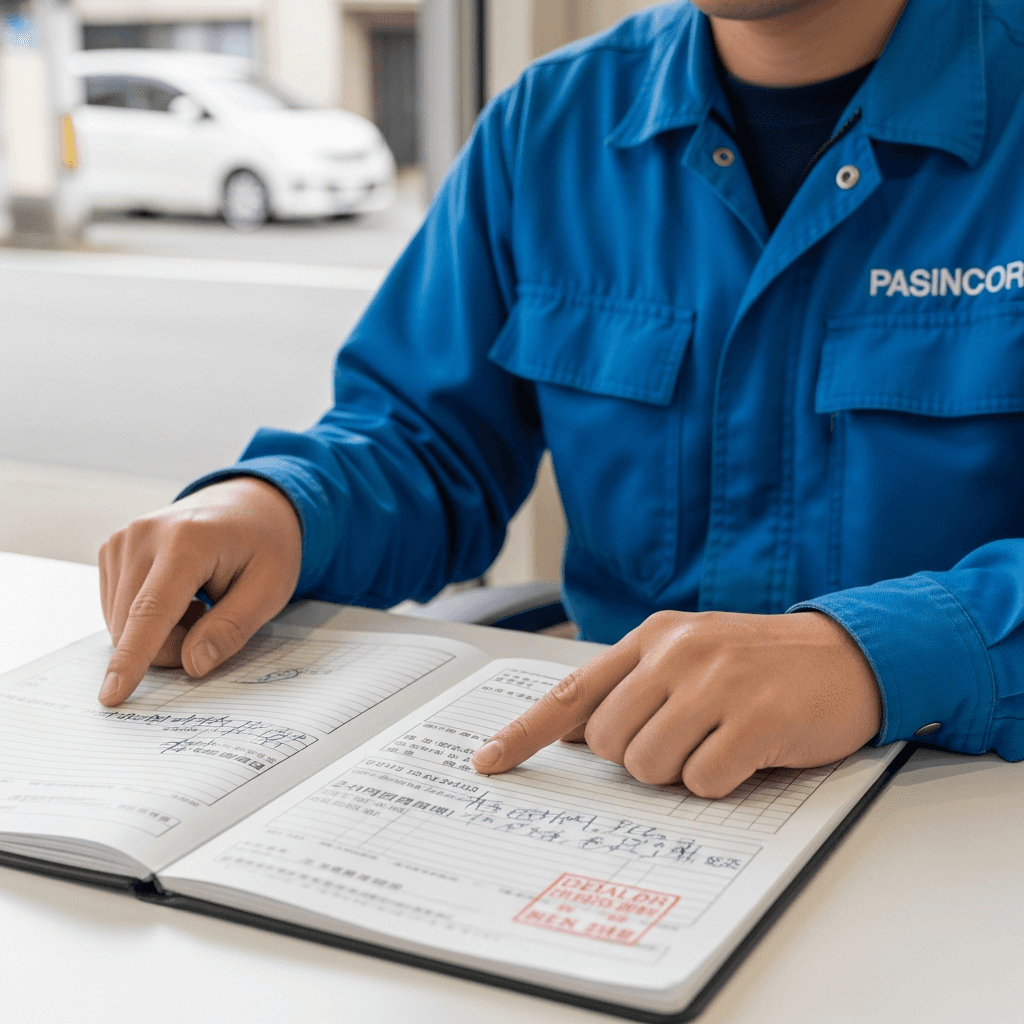 ロゴの整備記録簿に定期点検(12ヶ月・24ヶ月)の履歴が全て記載されていれば「管理の行き届いた車」と高評価。特にエンジンオイル交換履歴は重要で+6~9万円の効果。