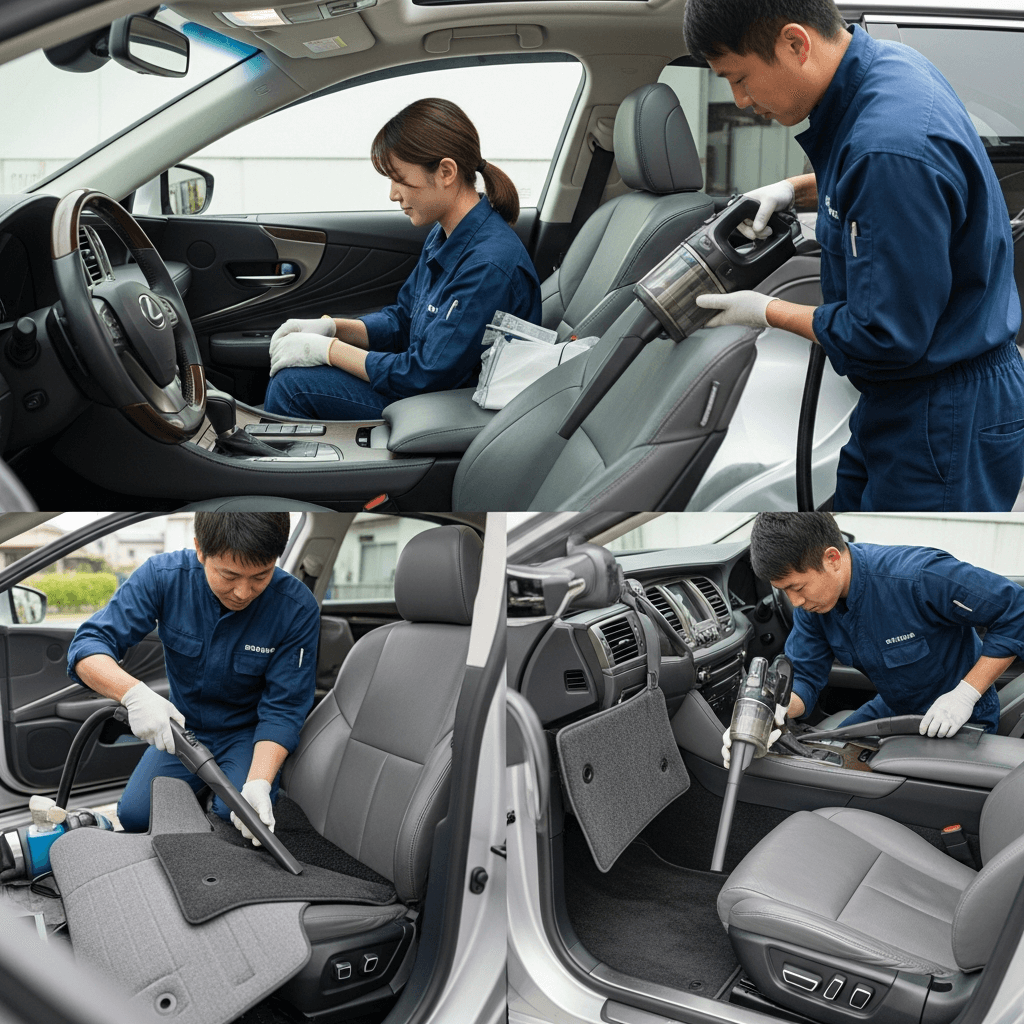 LSは第一印象が査定の8割を決めます。シート隙間のゴミ除去、マット洗浄、樹脂パーツ艶出しで新車級の清潔感に。特に臭いゼロなら「禁煙車」扱いで+5~8万円UP。