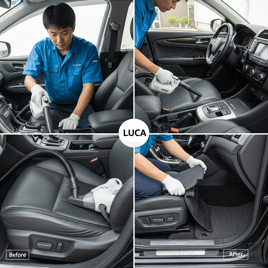 ルクラは第一印象が査定の8割を決めます。シート隙間のゴミ除去、マット洗浄、樹脂パーツ艶出しで新車級の清潔感に。特に臭いゼロなら「禁煙車」扱いで+5~8万円UP。