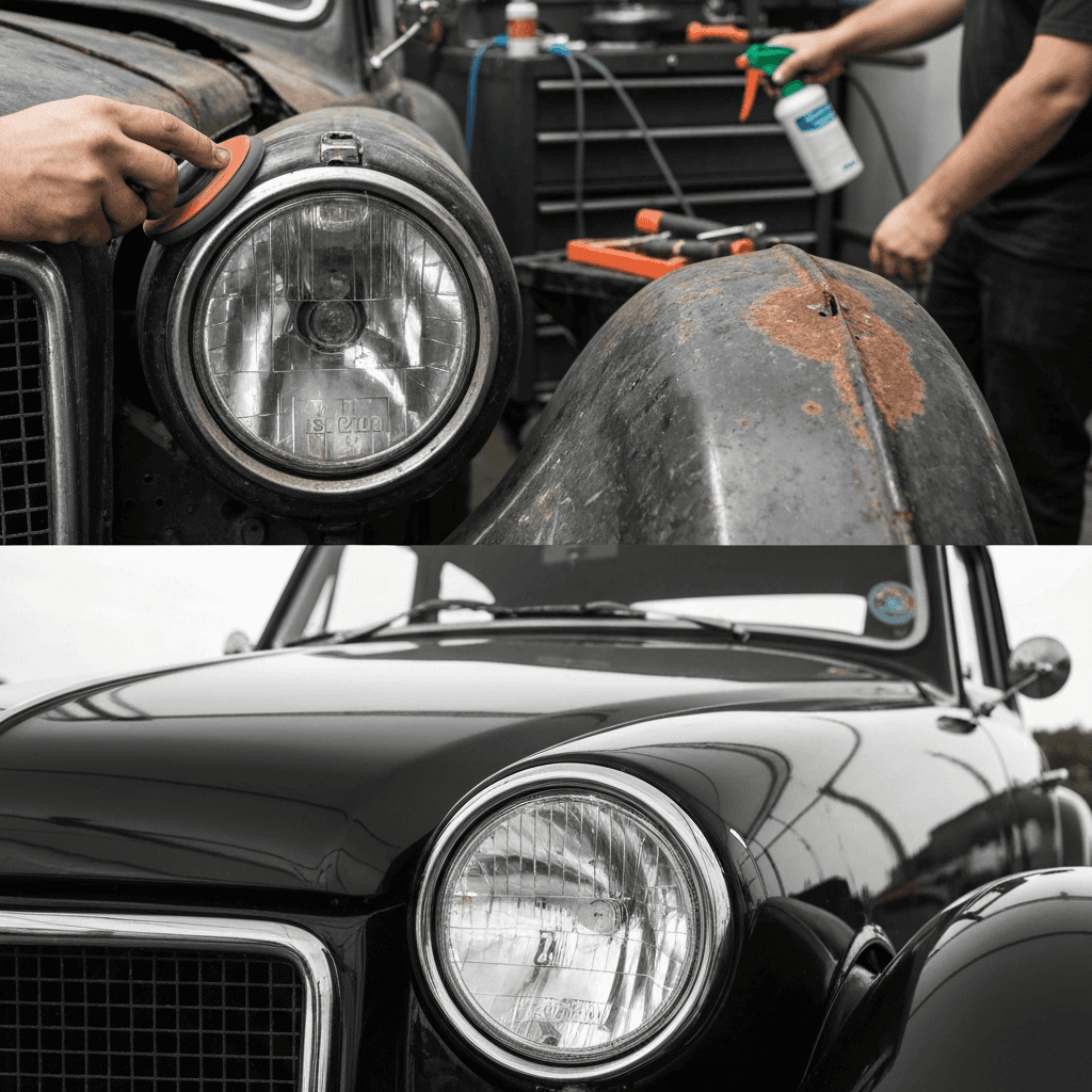 ルネッサはヘッドライトの黄ばみとボディの鉄粉が第一印象を損ねます。研磨+鉄粉除去クリーナー+ワックスで輝きを取り戻せば「程度良好」と判断され+4~7万円の効果。