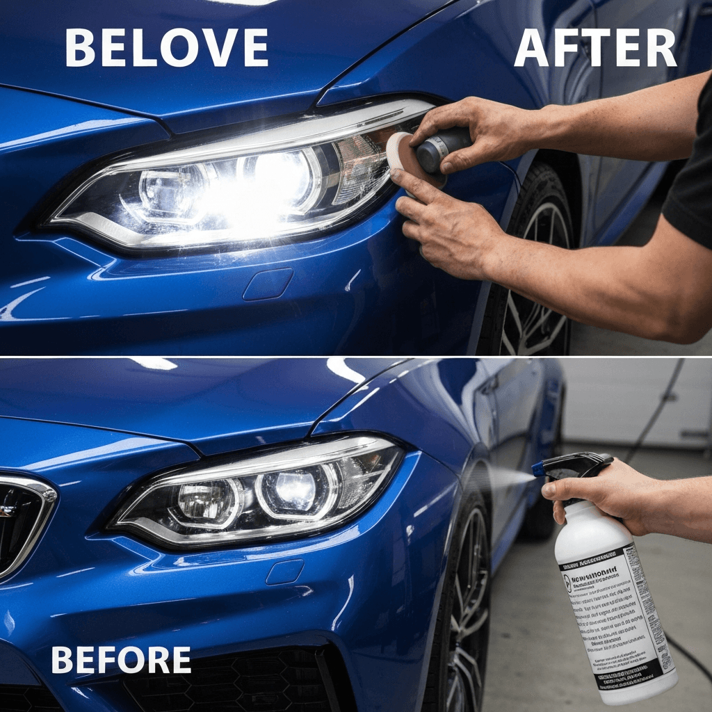 M2コンペティションはヘッドライトの黄ばみとボディの鉄粉が第一印象を損ねます。研磨+鉄粉除去クリーナー+ワックスで輝きを取り戻せば「程度良好」と判断され+4~7万円の効果。