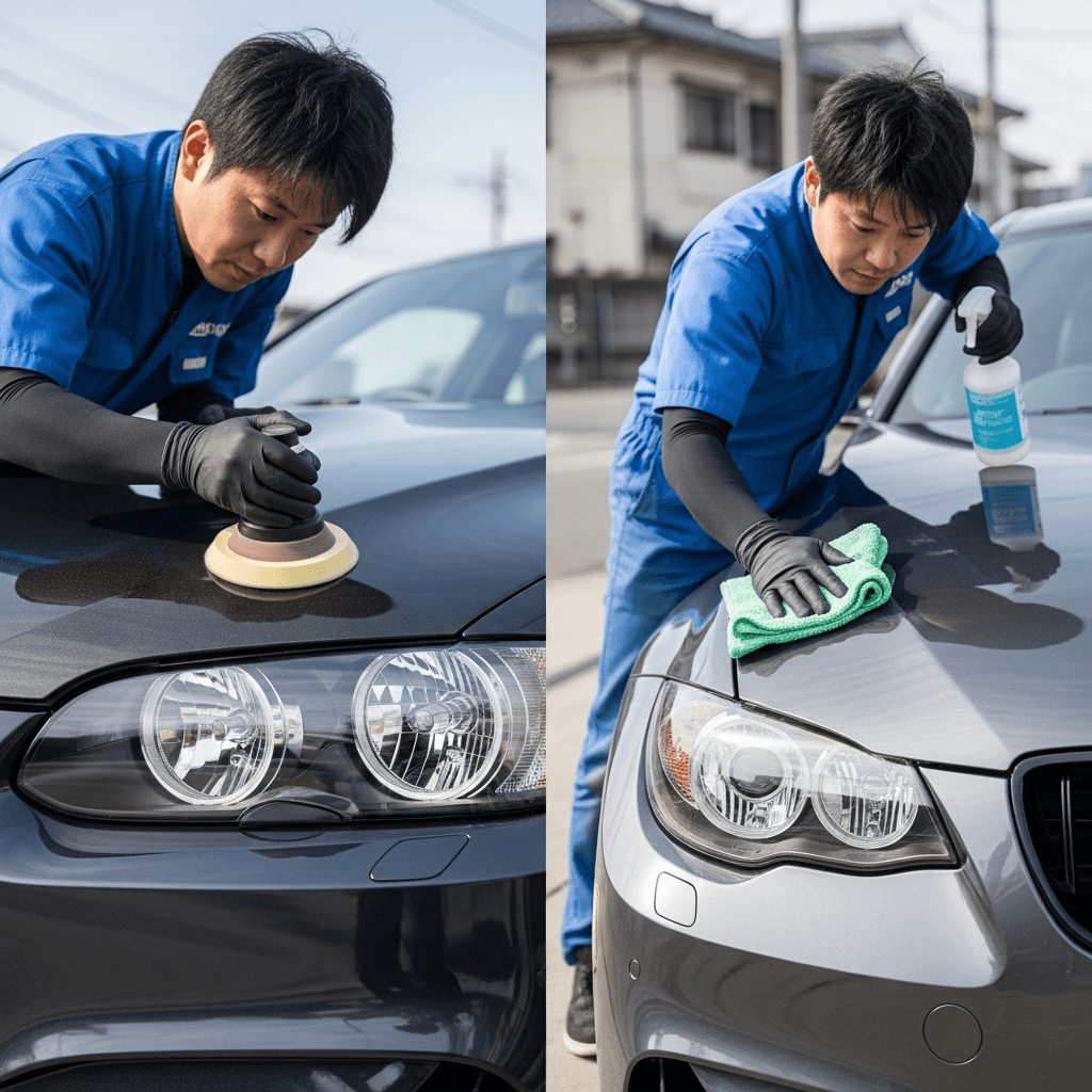 M3はヘッドライトの黄ばみとボディの鉄粉が第一印象を損ねます。研磨+鉄粉除去クリーナー+ワックスで輝きを取り戻せば「程度良好」と判断され+4~7万円の効果。