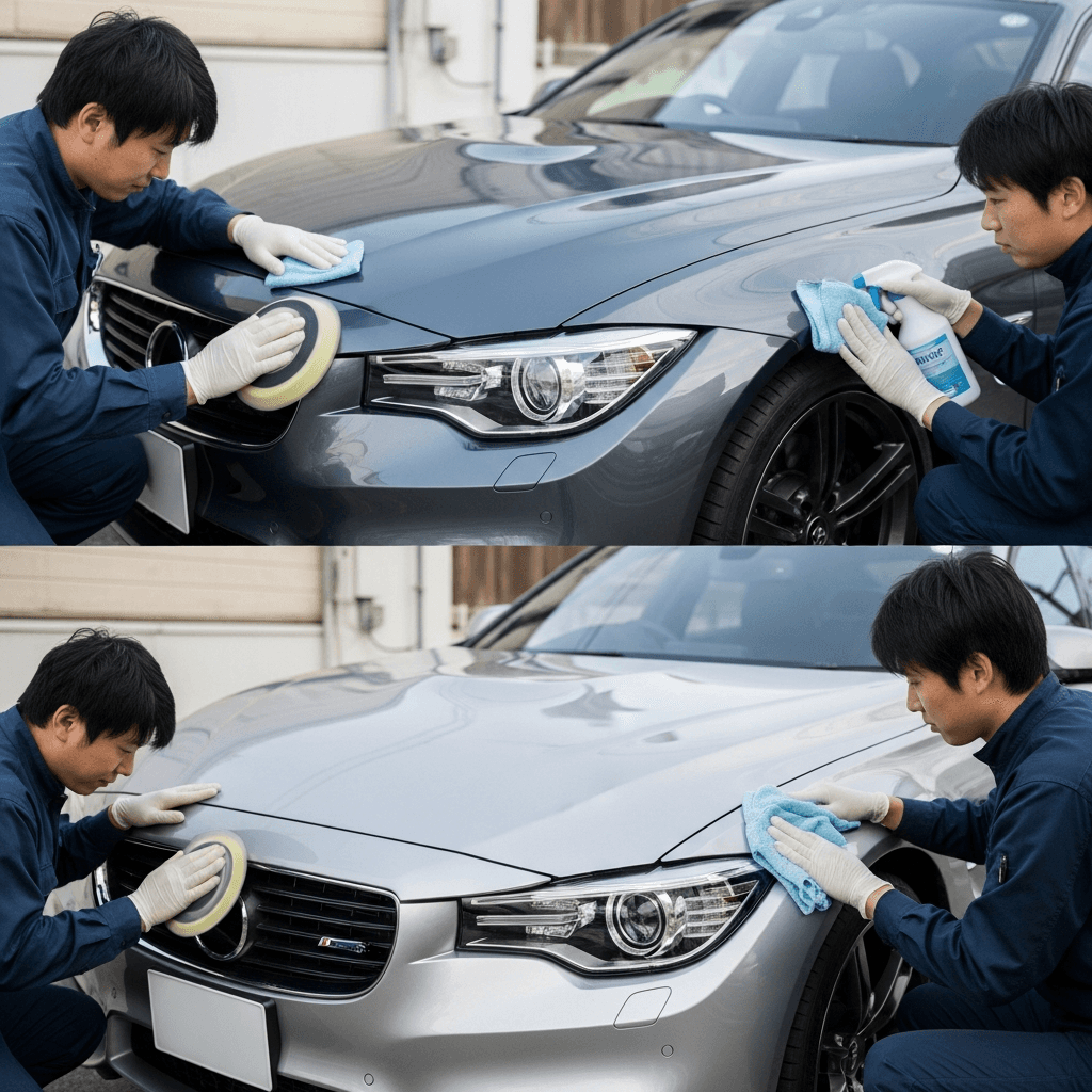 M3セダンはヘッドライトの黄ばみとボディの鉄粉が第一印象を損ねます。研磨+鉄粉除去クリーナー+ワックスで輝きを取り戻せば「程度良好」と判断され+4~7万円の効果。