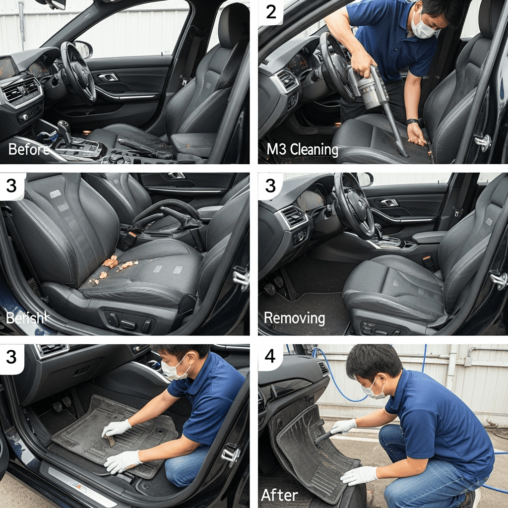 M3ツーリングは第一印象が査定の8割を決めます。シート隙間のゴミ除去、マット洗浄、樹脂パーツ艶出しで新車級の清潔感に。特に臭いゼロなら「禁煙車」扱いで+5~8万円UP。