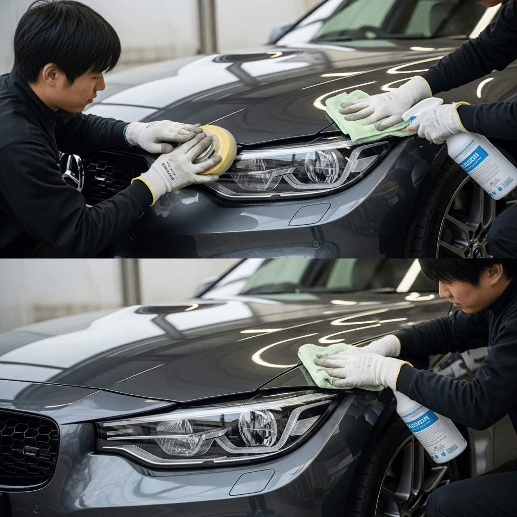 ヘッドライト黄ばみ除去+ボディ鉄粉除去で輝き復活!