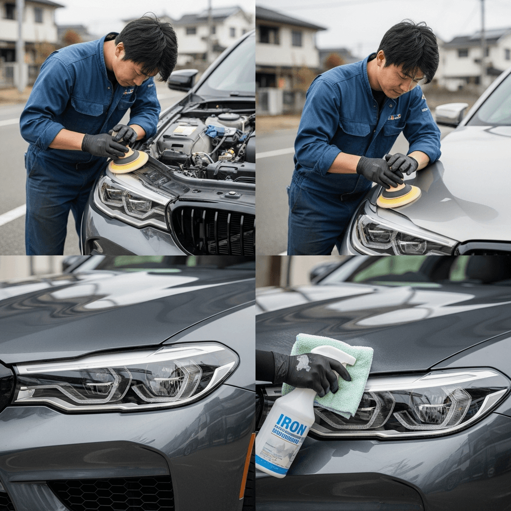 ヘッドライト黄ばみ除去+ボディ鉄粉除去で輝き復活!