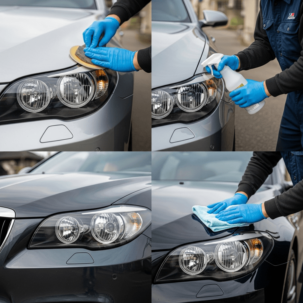 M5ツーリングはヘッドライトの黄ばみとボディの鉄粉が第一印象を損ねます。研磨+鉄粉除去クリーナー+ワックスで輝きを取り戻せば「程度良好」と判断され+4~7万円の効果。