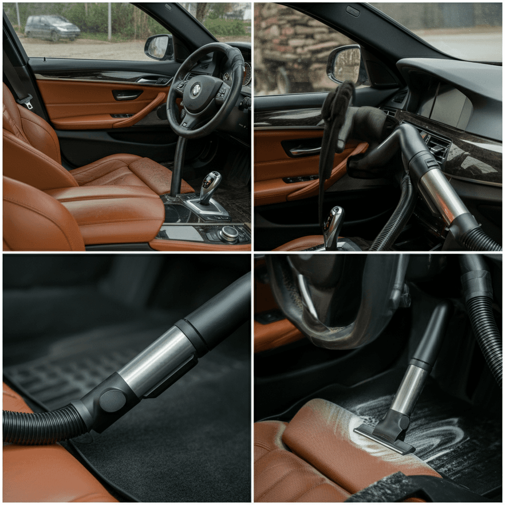 M5ツーリングは第一印象が査定の8割を決めます。シート隙間のゴミ除去、マット洗浄、樹脂パーツ艶出しで新車級の清潔感に。特に臭いゼロなら「禁煙車」扱いで+5~8万円UP。