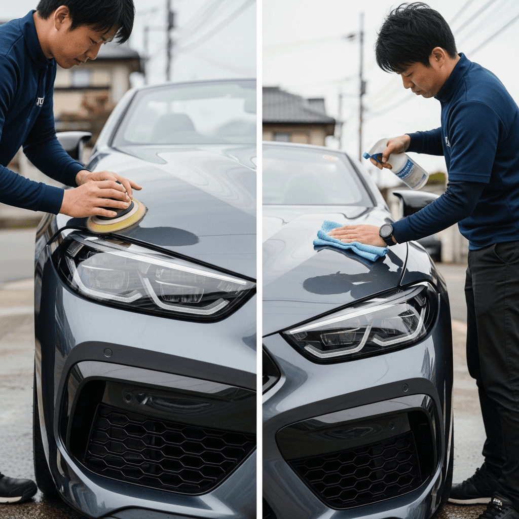 M8カブリオレはヘッドライトの黄ばみとボディの鉄粉が第一印象を損ねます。研磨+鉄粉除去クリーナー+ワックスで輝きを取り戻せば「程度良好」と判断され+4~7万円の効果。