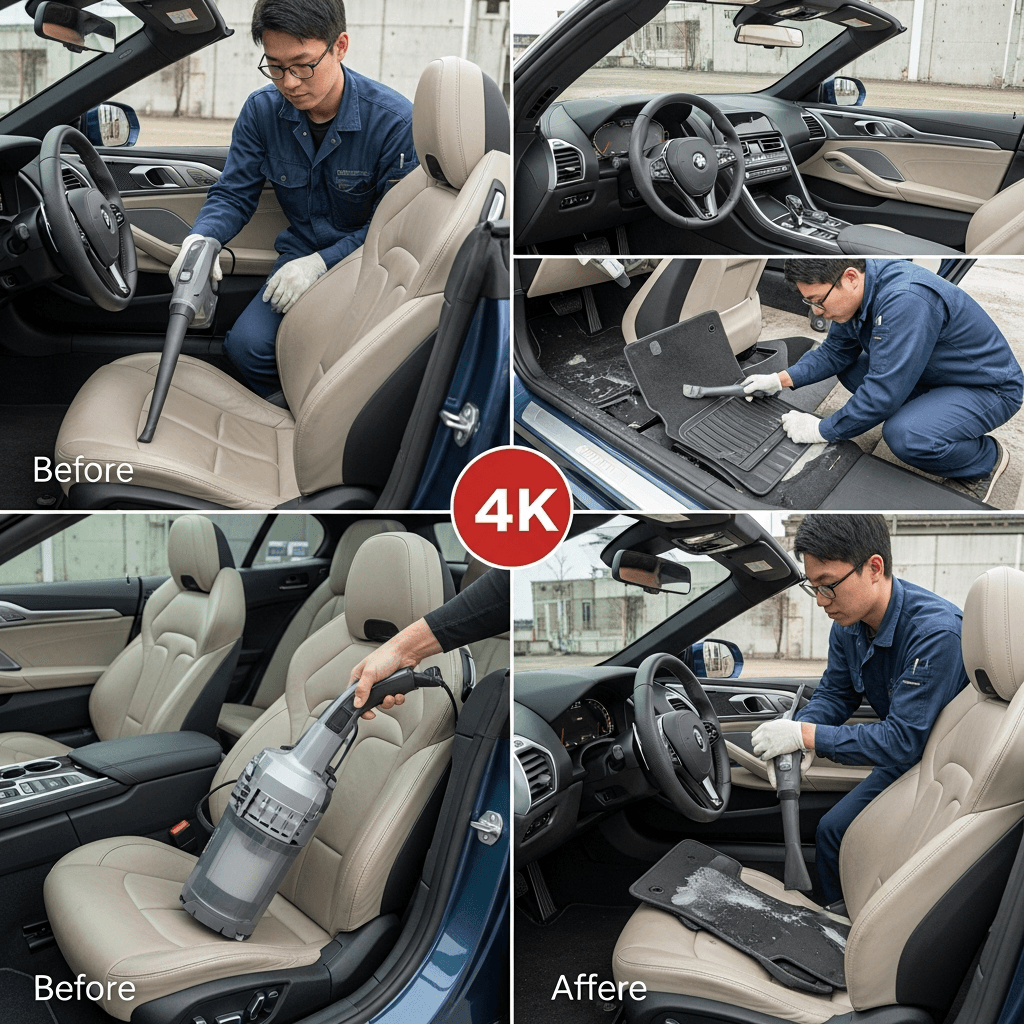 M8カブリオレは第一印象が査定の8割を決めます。シート隙間のゴミ除去、マット洗浄、樹脂パーツ艶出しで新車級の清潔感に。特に臭いゼロなら「禁煙車」扱いで+5~8万円UP。