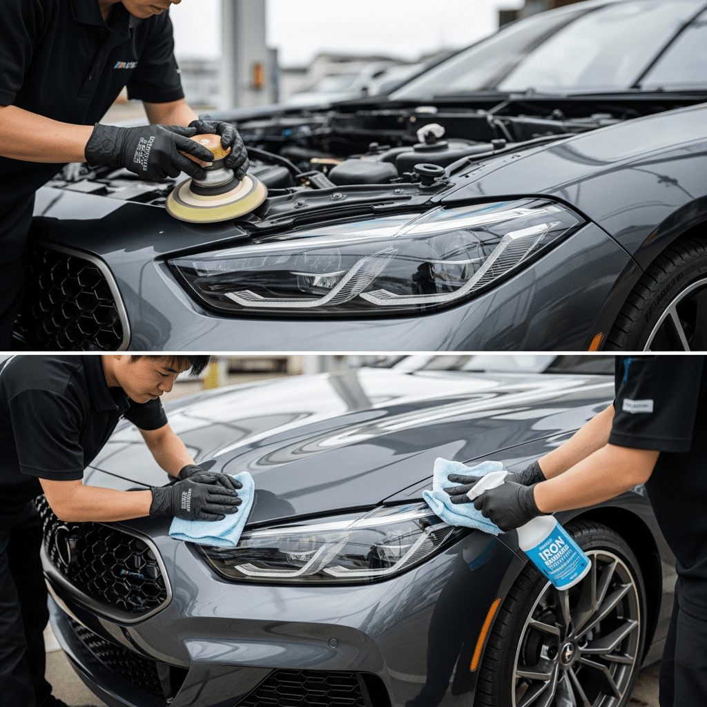 ヘッドライト黄ばみ除去+ボディ鉄粉除去で輝き復活!