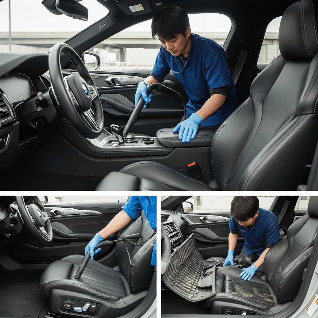 M8グランクーペは第一印象が査定の8割を決めます。シート隙間のゴミ除去、マット洗浄、樹脂パーツ艶出しで新車級の清潔感に。特に臭いゼロなら「禁煙車」扱いで+5~8万円UP。