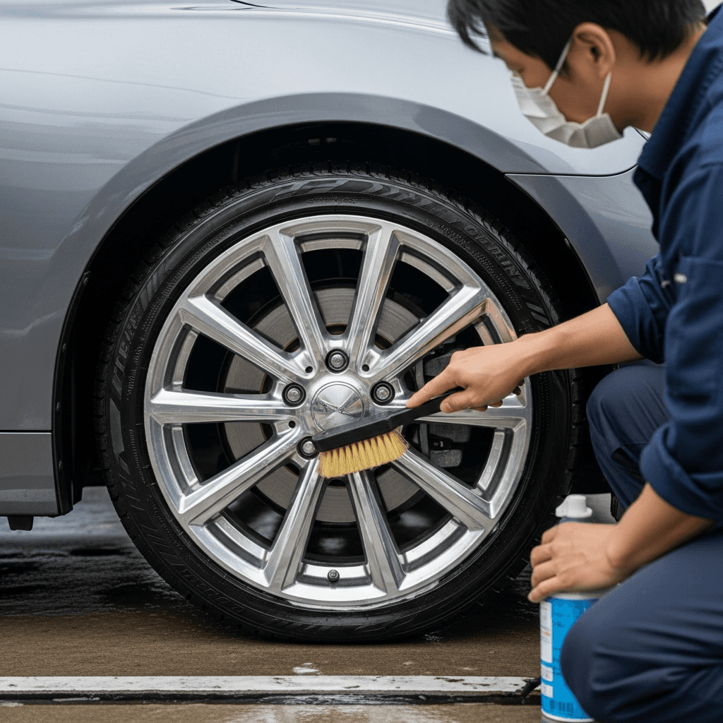 セダンは純正アルミホイールの傷が目立ちやすい。ホイールクリーナーで洗浄+タイヤ溝5mm以上確保で「足回り良好」評価。特にマークXは高級感が重要で+6~9万円の効果。