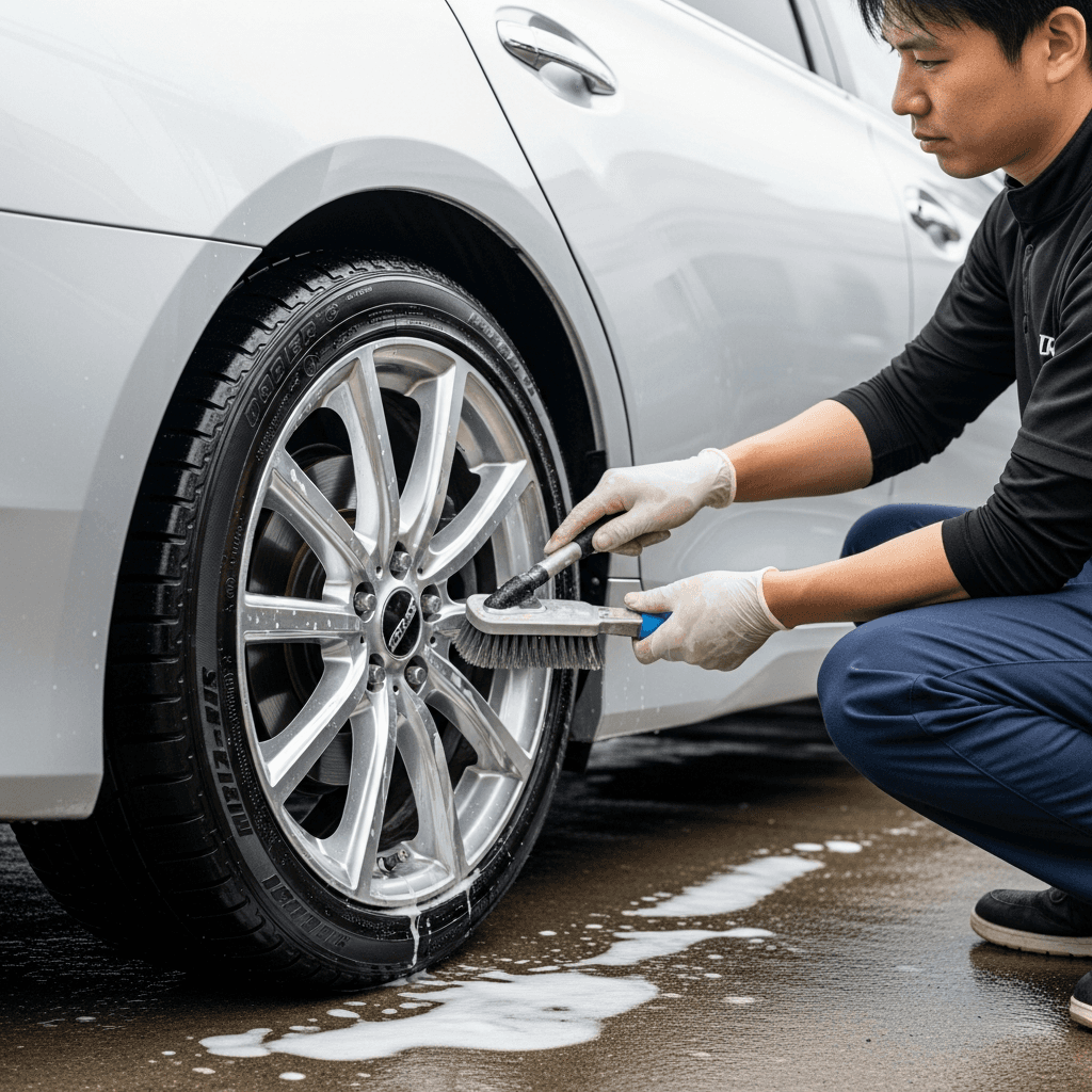 セダンは純正アルミホイールの傷が目立ちやすい。ホイールクリーナーで洗浄+タイヤ溝5mm以上確保で「足回り良好」評価。特にマークXジオは高級感が重要で+6~9万円の効果。