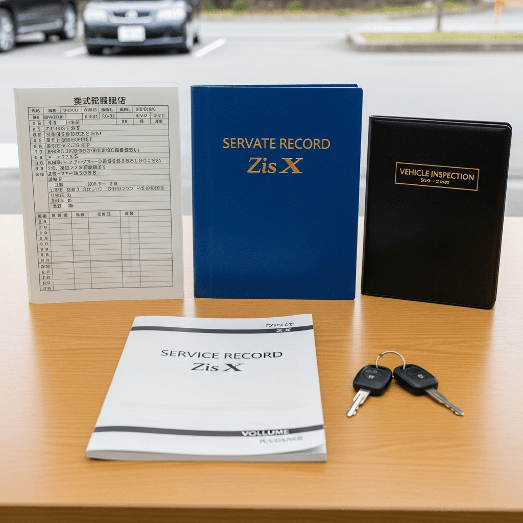 マークXジオは高級セダンとして書類完備が必須。整備記録簿、取扱説明書、スペアキー2本が揃っていれば「ワンオーナー級の管理」で+4~7万円UP。特にスペアキーは重要。