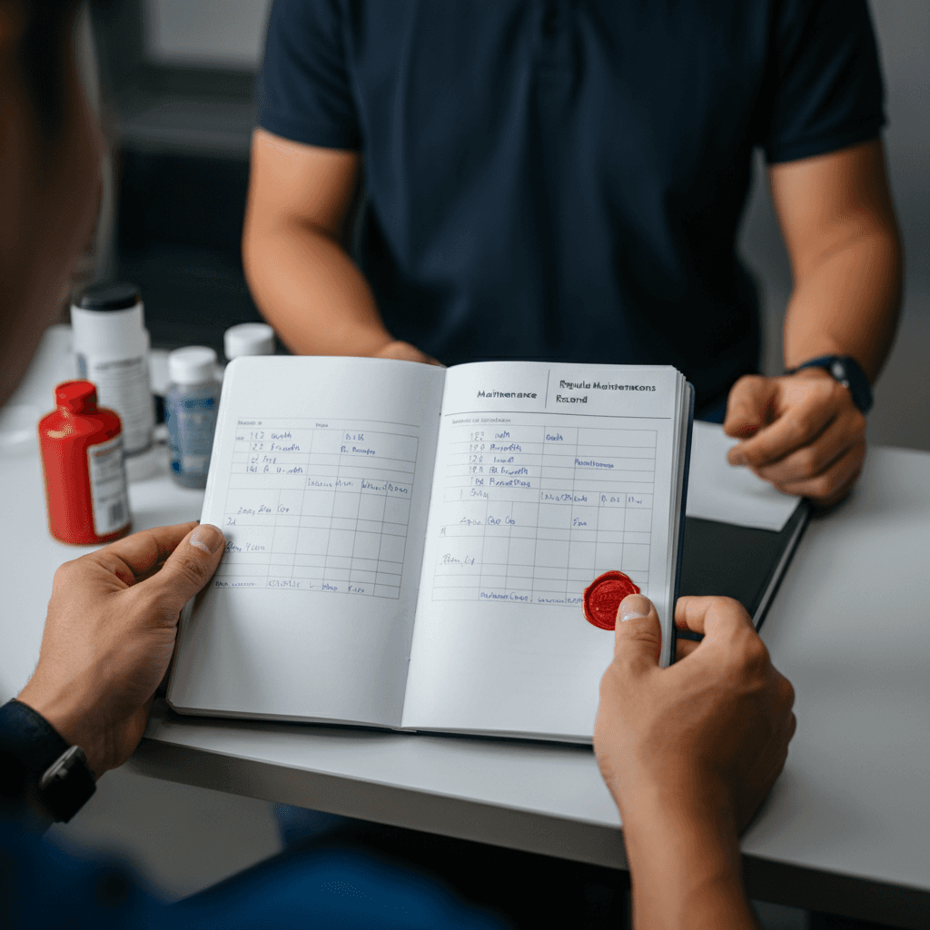 MAZDA2の整備記録簿に定期点検(12ヶ月・24ヶ月)の履歴が全て記載されていれば「管理の行き届いた車」と高評価。特にエンジンオイル交換履歴は重要で+6~9万円の効果。