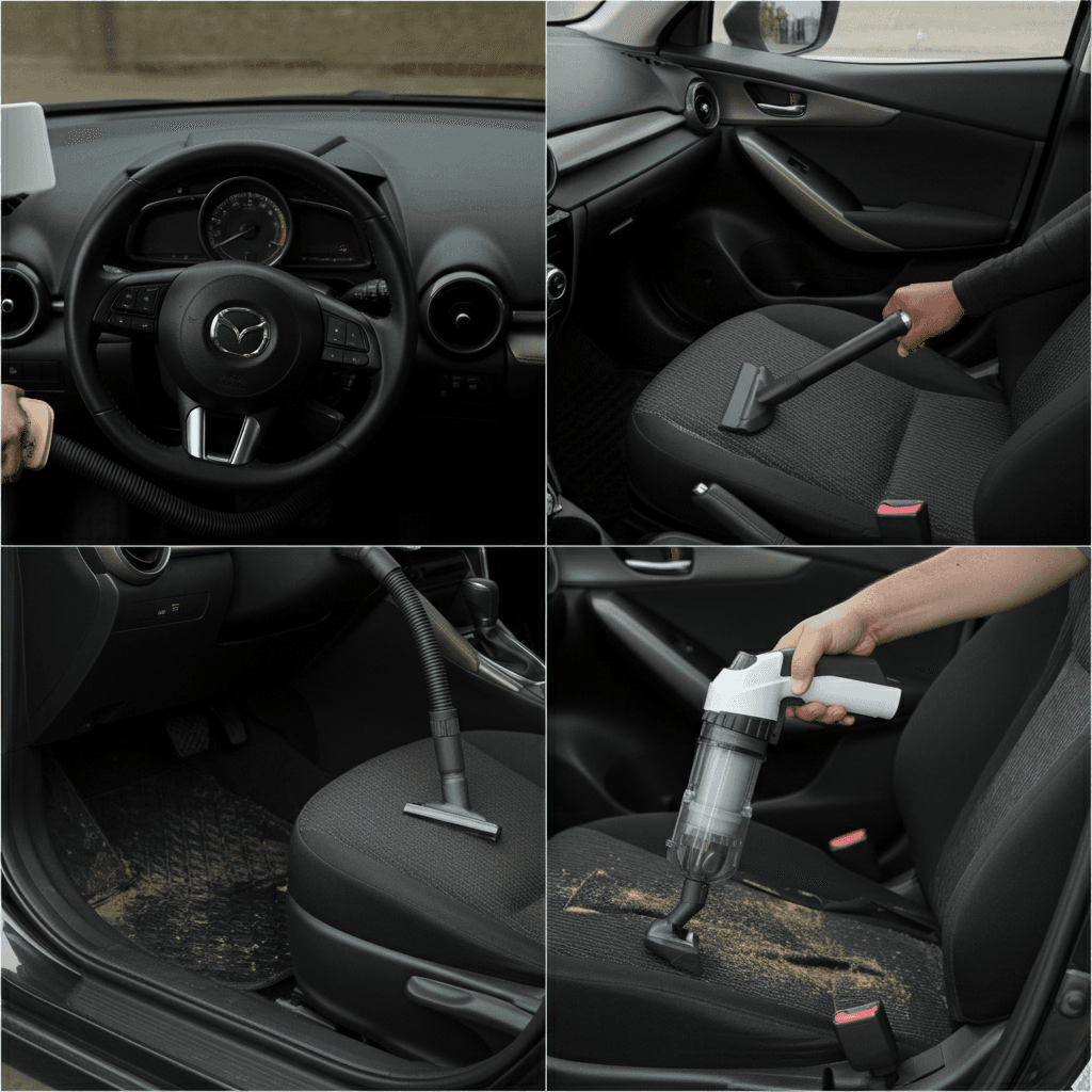 MAZDA2は第一印象が査定の8割を決めます。シート隙間のゴミ除去、マット洗浄、樹脂パーツ艶出しで新車級の清潔感に。特に臭いゼロなら「禁煙車」扱いで+5~8万円UP。