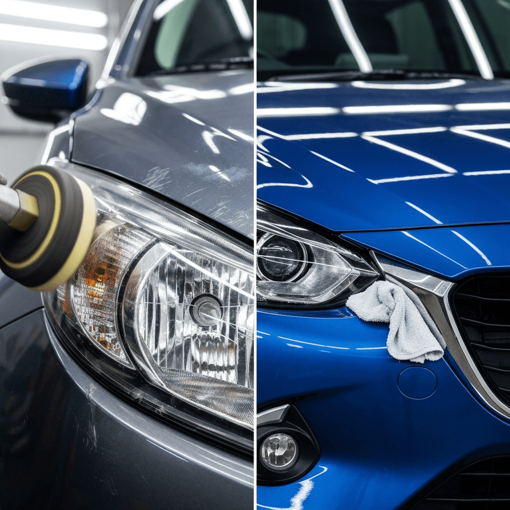 MAZDA2はヘッドライトの黄ばみとボディの鉄粉が第一印象を損ねます。研磨+鉄粉除去クリーナー+ワックスで輝きを取り戻せば「程度良好」と判断され+4~7万円の効果。