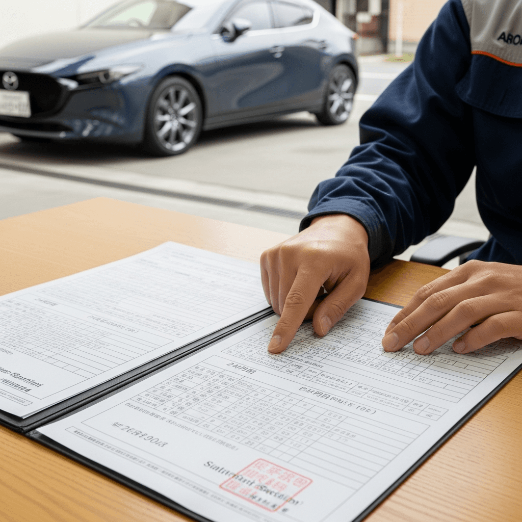 MAZDA3ファストバックの整備記録簿に定期点検(12ヶ月・24ヶ月)の履歴が全て記載されていれば「管理の行き届いた車」と高評価。特にエンジンオイル交換履歴は重要で+6~9万円の効果。