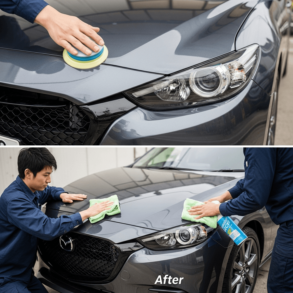 MAZDA3ファストバックはヘッドライトの黄ばみとボディの鉄粉が第一印象を損ねます。研磨+鉄粉除去クリーナー+ワックスで輝きを取り戻せば「程度良好」と判断され+4~7万円の効果。