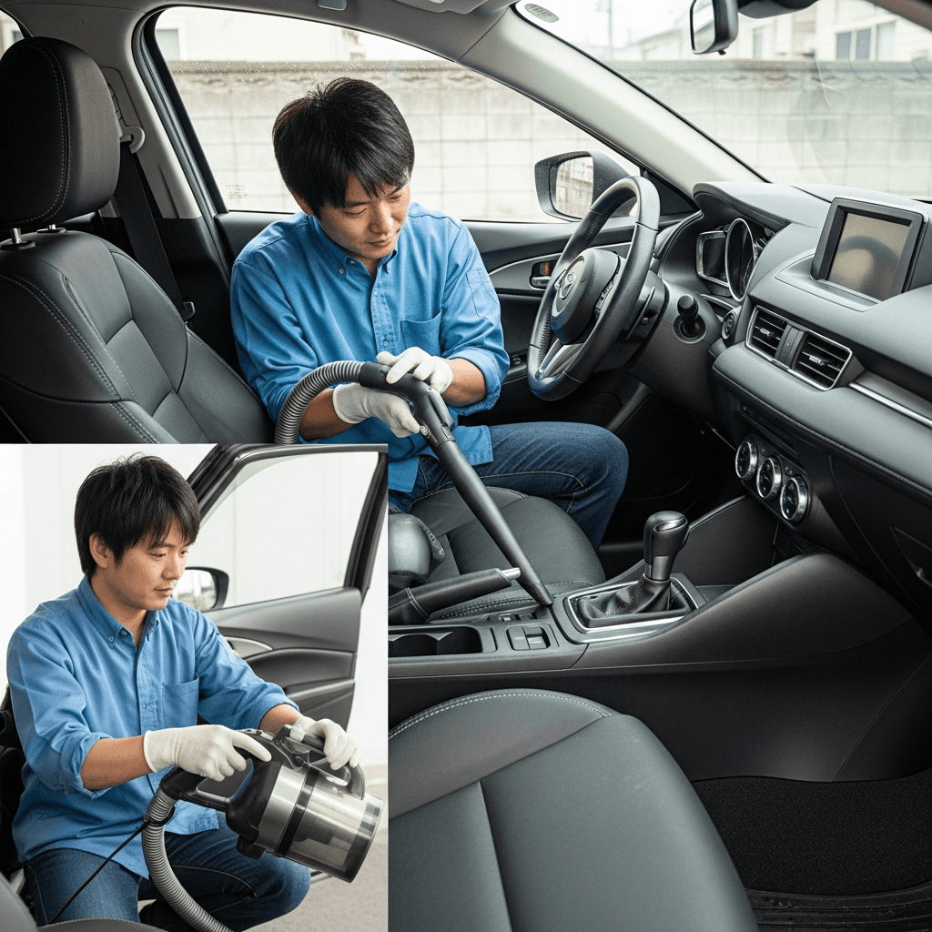 MAZDA3ファストバックは第一印象が査定の8割を決めます。シート隙間のゴミ除去、マット洗浄、樹脂パーツ艶出しで新車級の清潔感に。特に臭いゼロなら「禁煙車」扱いで+5~8万円UP。