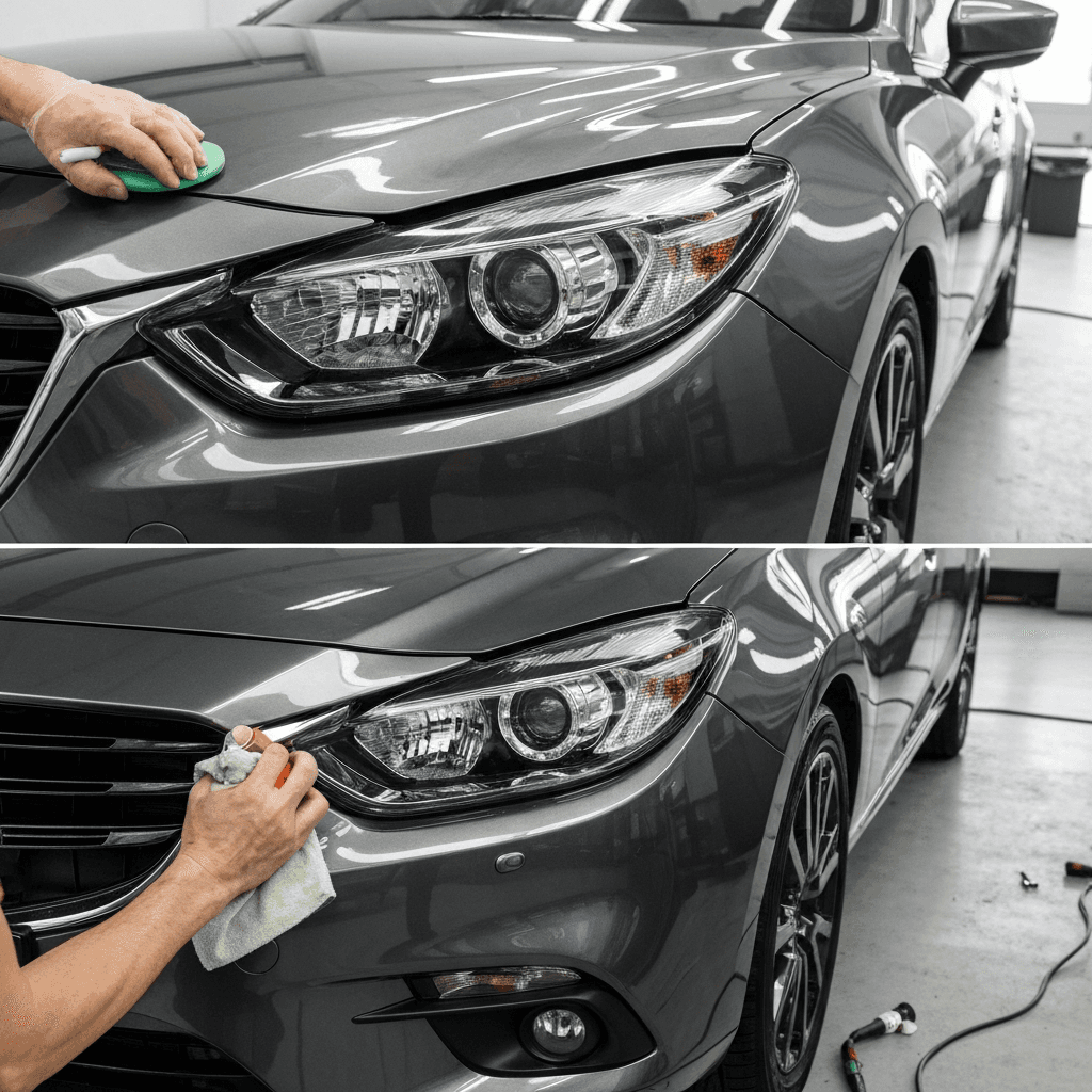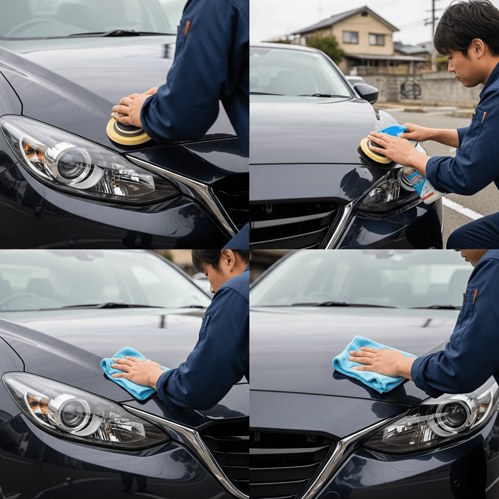 MAZDA3セダンはヘッドライトの黄ばみとボディの鉄粉が第一印象を損ねます。研磨+鉄粉除去クリーナー+ワックスで輝きを取り戻せば「程度良好」と判断され+4~7万円の効果。