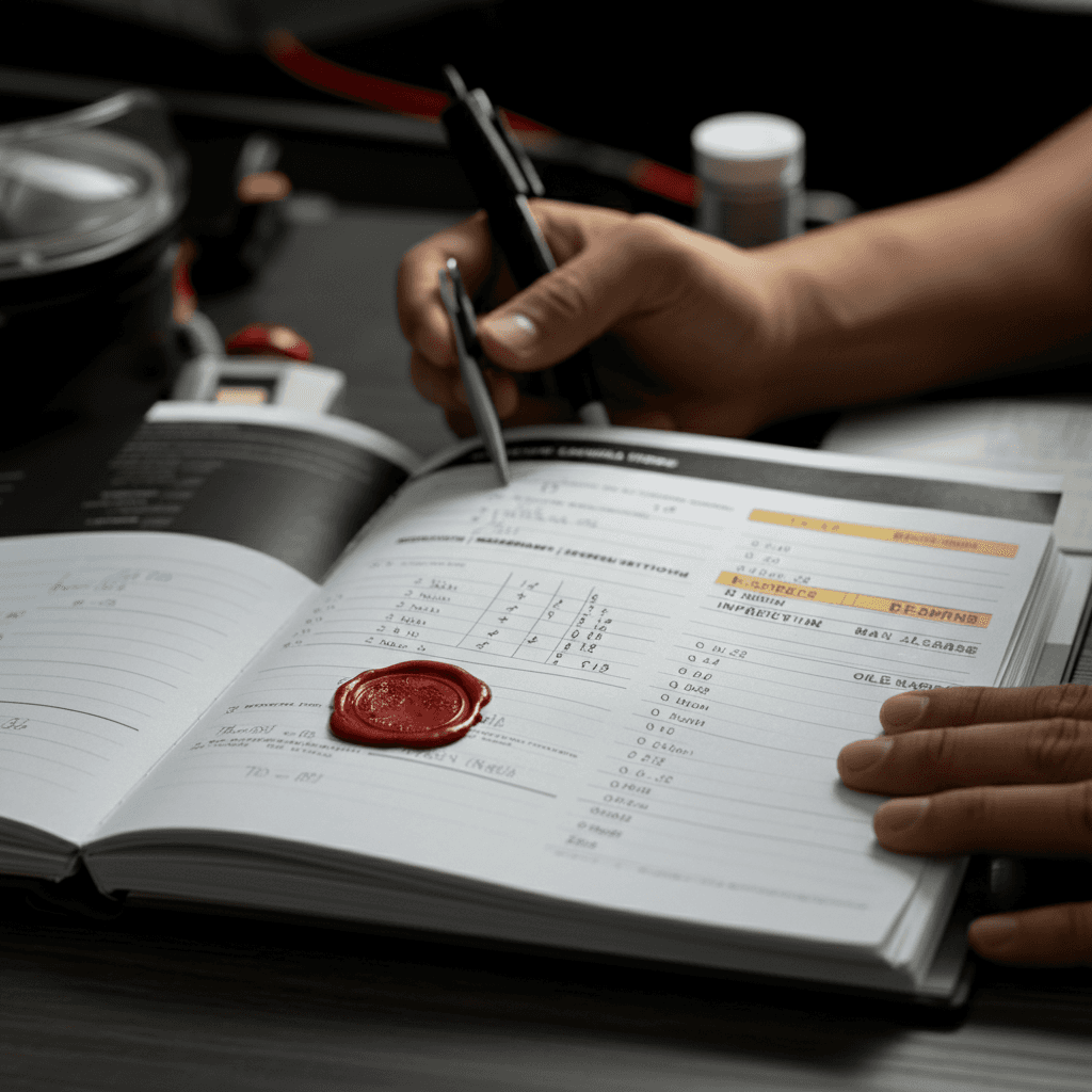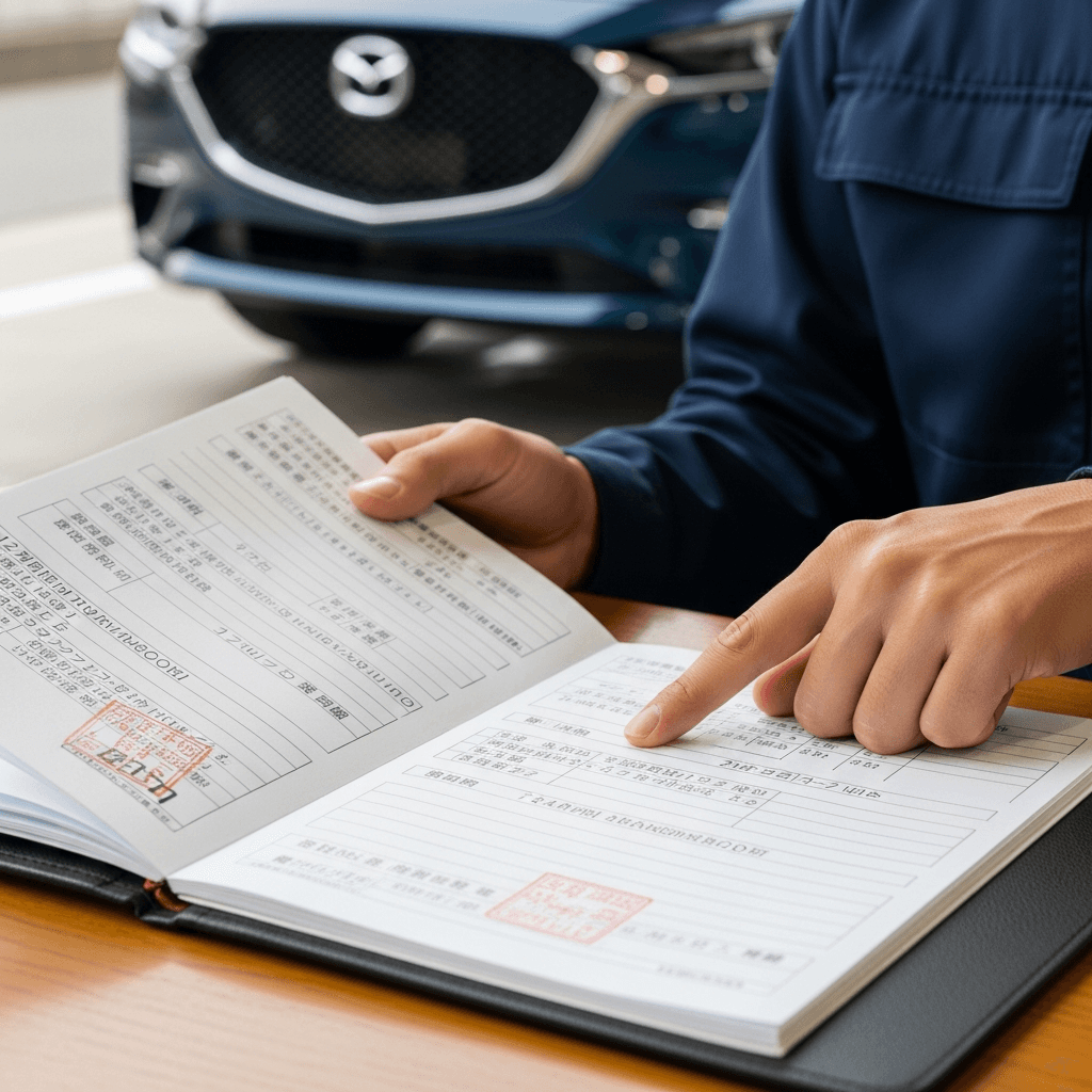 MAZDA3セダンの整備記録簿に定期点検(12ヶ月・24ヶ月)の履歴が全て記載されていれば「管理の行き届いた車」と高評価。特にエンジンオイル交換履歴は重要で+6~9万円の効果。