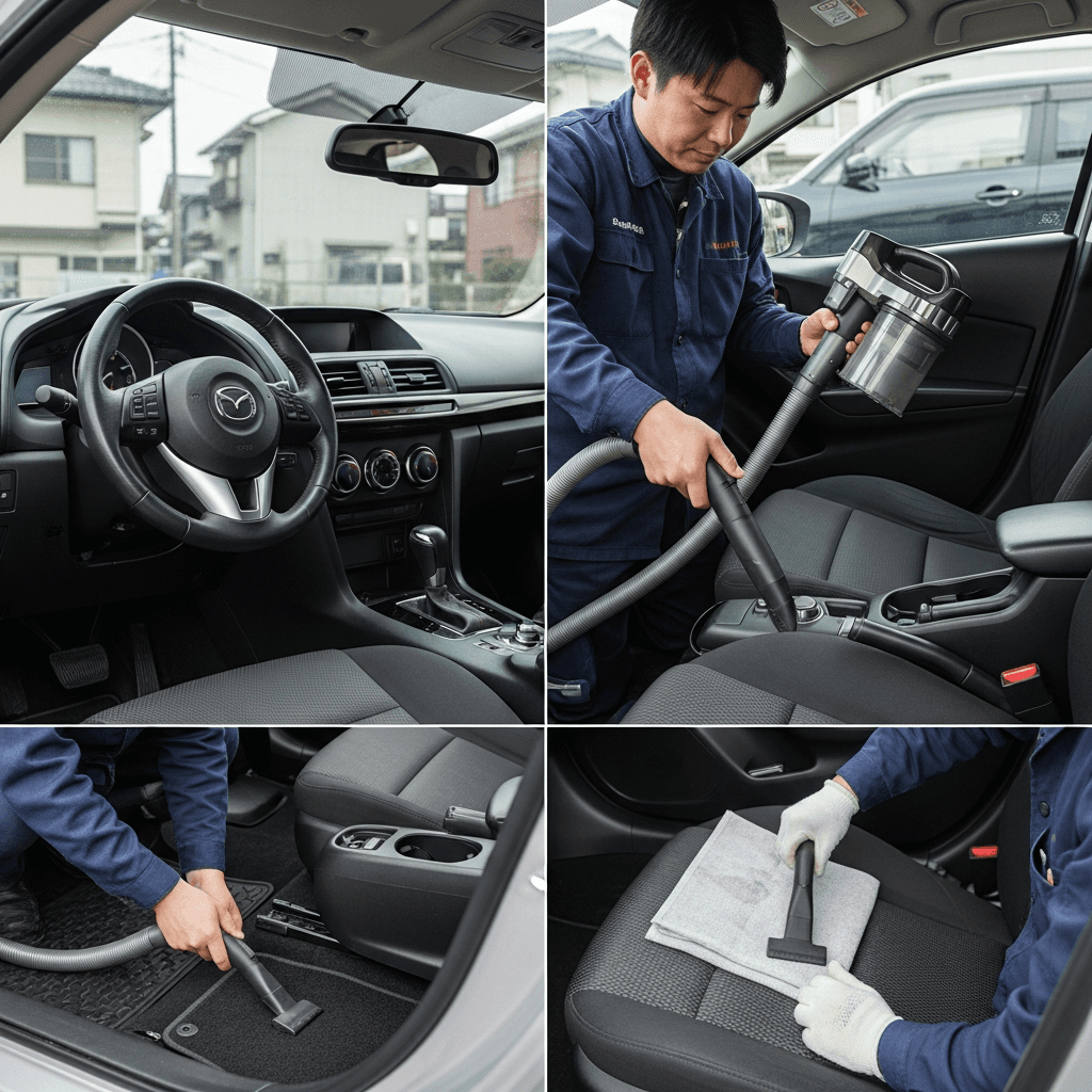 MAZDA3セダンは第一印象が査定の8割を決めます。シート隙間のゴミ除去、マット洗浄、樹脂パーツ艶出しで新車級の清潔感に。特に臭いゼロなら「禁煙車」扱いで+5~8万円UP。