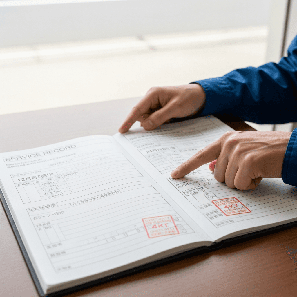 ミディアムクラスの整備記録簿に定期点検(12ヶ月・24ヶ月)の履歴が全て記載されていれば「管理の行き届いた車」と高評価。特にエンジンオイル交換履歴は重要で+6~9万円の効果。