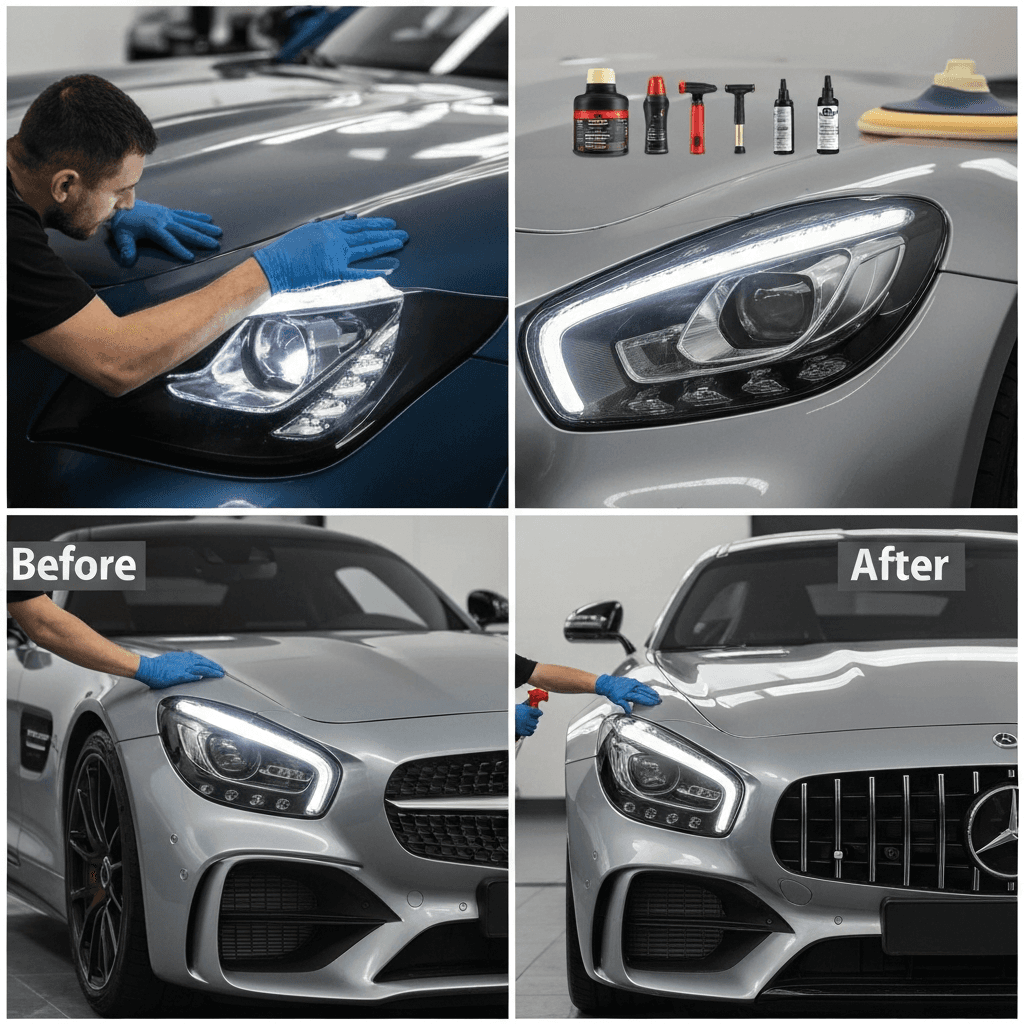 メルセデスAMG GTはヘッドライトの黄ばみとボディの鉄粉が第一印象を損ねます。研磨+鉄粉除去クリーナー+ワックスで輝きを取り戻せば「程度良好」と判断され+4~7万円の効果。