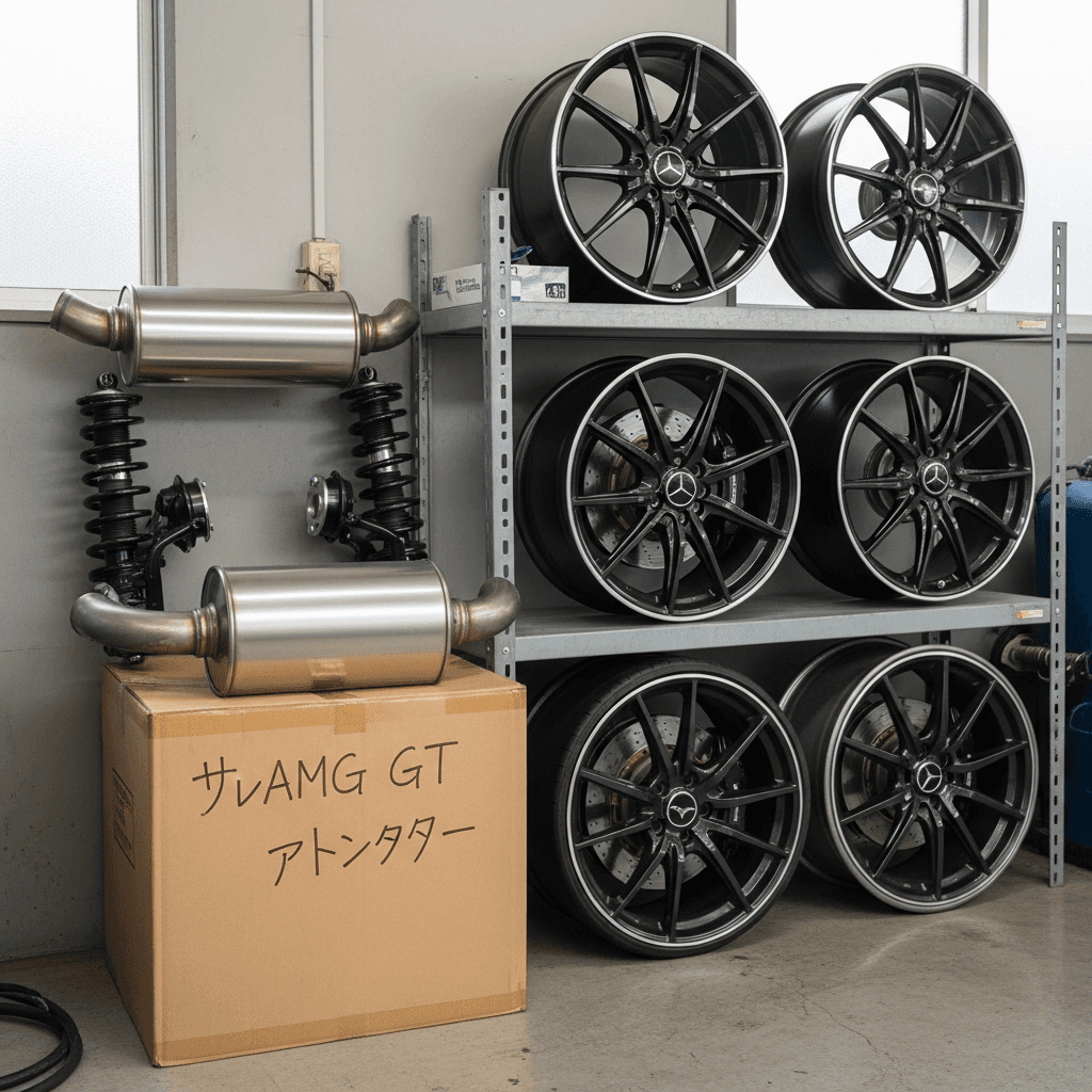 メルセデスAMG GT ロードスターはカスタム車両が多いですが、純正マフラー・サスペンション・ホイールが保管されていれば査定額は下がりません。「純正戻し可能」をアピールすることで+7~10万円の価値創出。