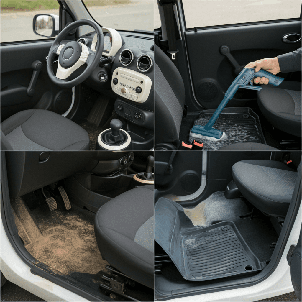 マイクロカーは第一印象が査定の8割を決めます。シート隙間のゴミ除去、マット洗浄、樹脂パーツ艶出しで新車級の清潔感に。特に臭いゼロなら「禁煙車」扱いで+5~8万円UP。