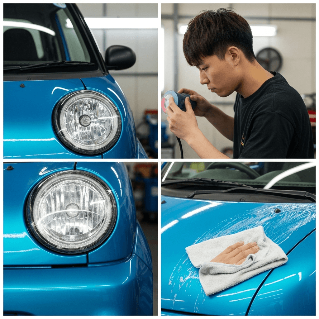 マイクロカーはヘッドライトの黄ばみとボディの鉄粉が第一印象を損ねます。研磨+鉄粉除去クリーナー+ワックスで輝きを取り戻せば「程度良好」と判断され+4~7万円の効果。