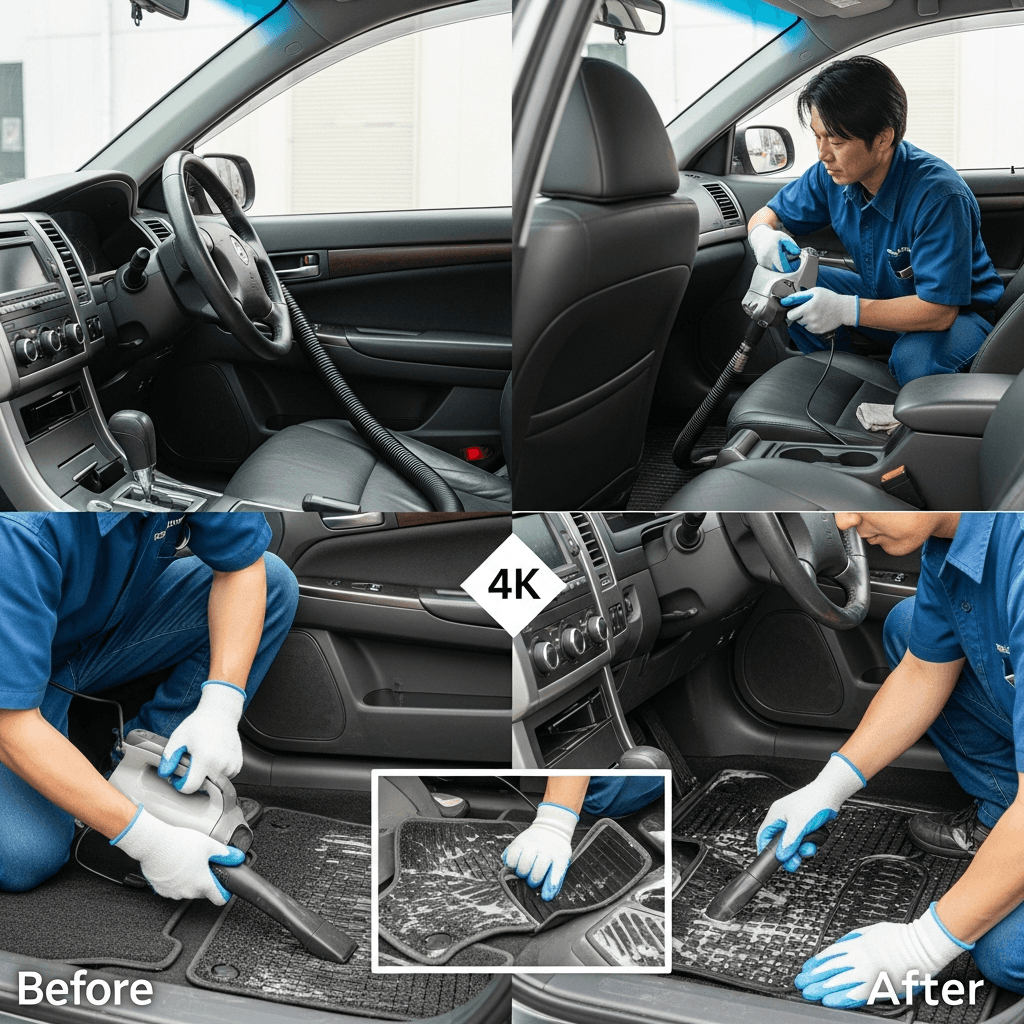 ミレーニアは第一印象が査定の8割を決めます。シート隙間のゴミ除去、マット洗浄、樹脂パーツ艶出しで新車級の清潔感に。特に臭いゼロなら「禁煙車」扱いで+5~8万円UP。