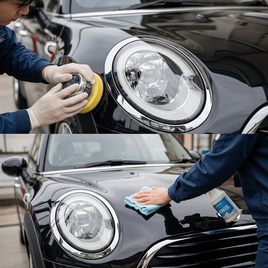 ミニはヘッドライトの黄ばみとボディの鉄粉が第一印象を損ねます。研磨+鉄粉除去クリーナー+ワックスで輝きを取り戻せば「程度良好」と判断され+4~7万円の効果。