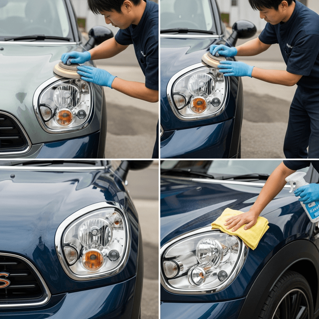 ミニカントリーマンはヘッドライトの黄ばみとボディの鉄粉が第一印象を損ねます。研磨+鉄粉除去クリーナー+ワックスで輝きを取り戻せば「程度良好」と判断され+4~7万円の効果。