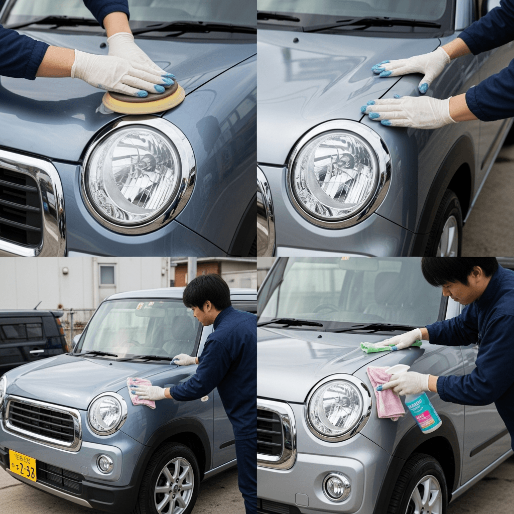 ミニカトッポタウンビーはヘッドライトの黄ばみとボディの鉄粉が第一印象を損ねます。研磨+鉄粉除去クリーナー+ワックスで輝きを取り戻せば「程度良好」と判断され+4~7万円の効果。