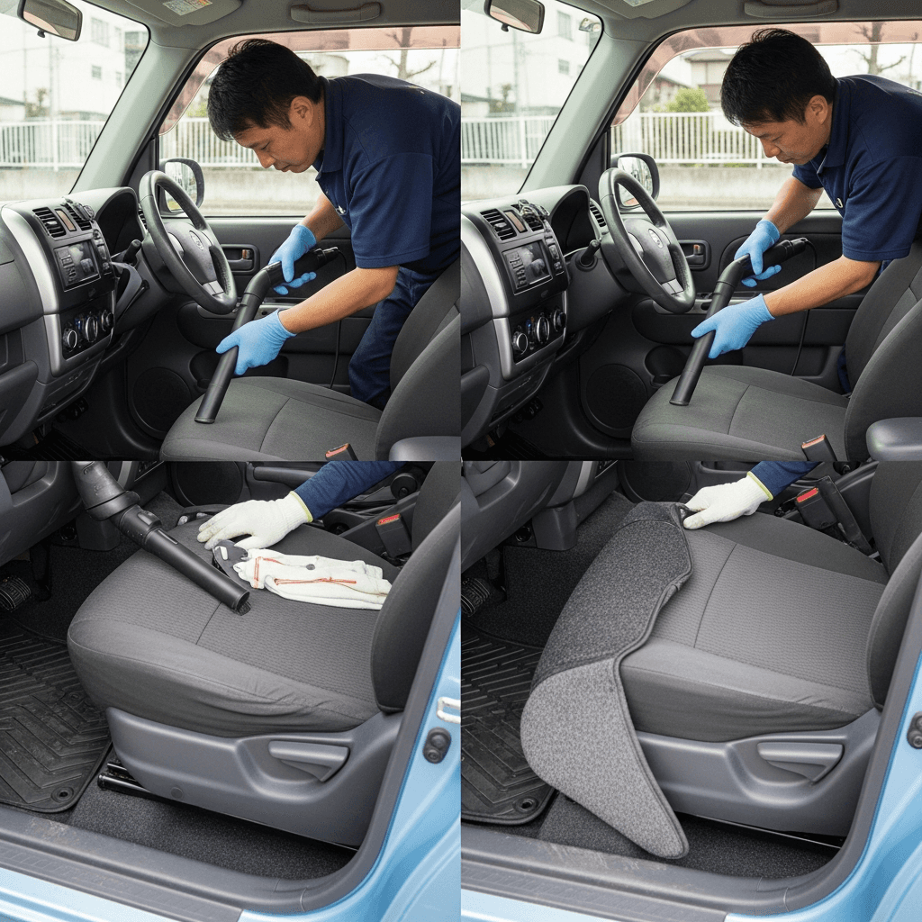 ミニカトッポタウンビーは第一印象が査定の8割を決めます。シート隙間のゴミ除去、マット洗浄、樹脂パーツ艶出しで新車級の清潔感に。特に臭いゼロなら「禁煙車」扱いで+5~8万円UP。