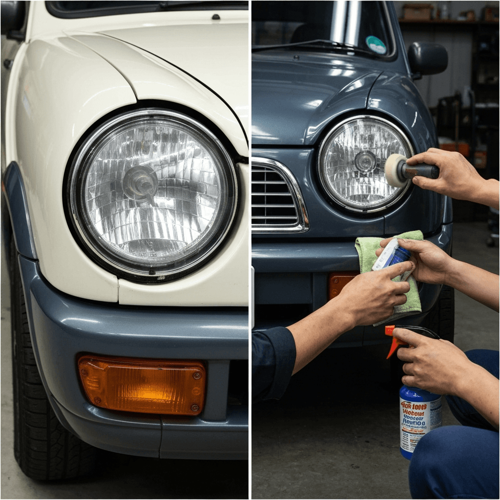 ミニカタウンビーはヘッドライトの黄ばみとボディの鉄粉が第一印象を損ねます。研磨+鉄粉除去クリーナー+ワックスで輝きを取り戻せば「程度良好」と判断され+4~7万円の効果。