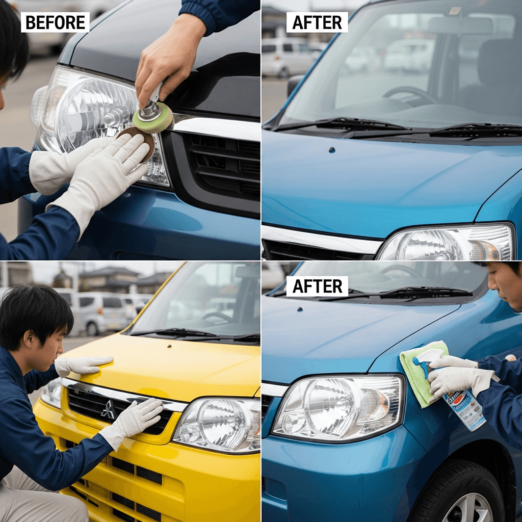 ミニキャブブラボーはヘッドライトの黄ばみとボディの鉄粉が第一印象を損ねます。研磨+鉄粉除去クリーナー+ワックスで輝きを取り戻せば「程度良好」と判断され+4~7万円の効果。