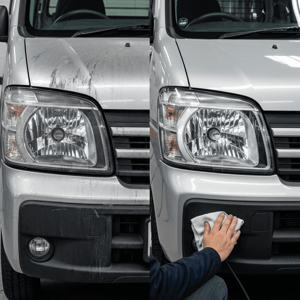 ミニキャブミーブトラックはヘッドライトの黄ばみとボディの鉄粉が第一印象を損ねます。研磨+鉄粉除去クリーナー+ワックスで輝きを取り戻せば「程度良好」と判断され+4~7万円の効果。