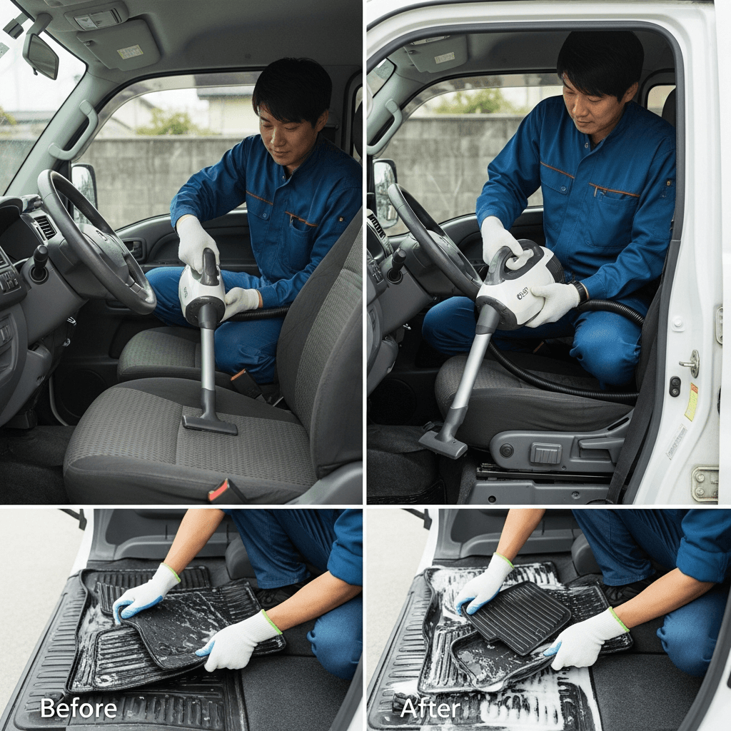 ミニキャブトラックは第一印象が査定の8割を決めます。シート隙間のゴミ除去、マット洗浄、樹脂パーツ艶出しで新車級の清潔感に。特に臭いゼロなら「禁煙車」扱いで+5~8万円UP。