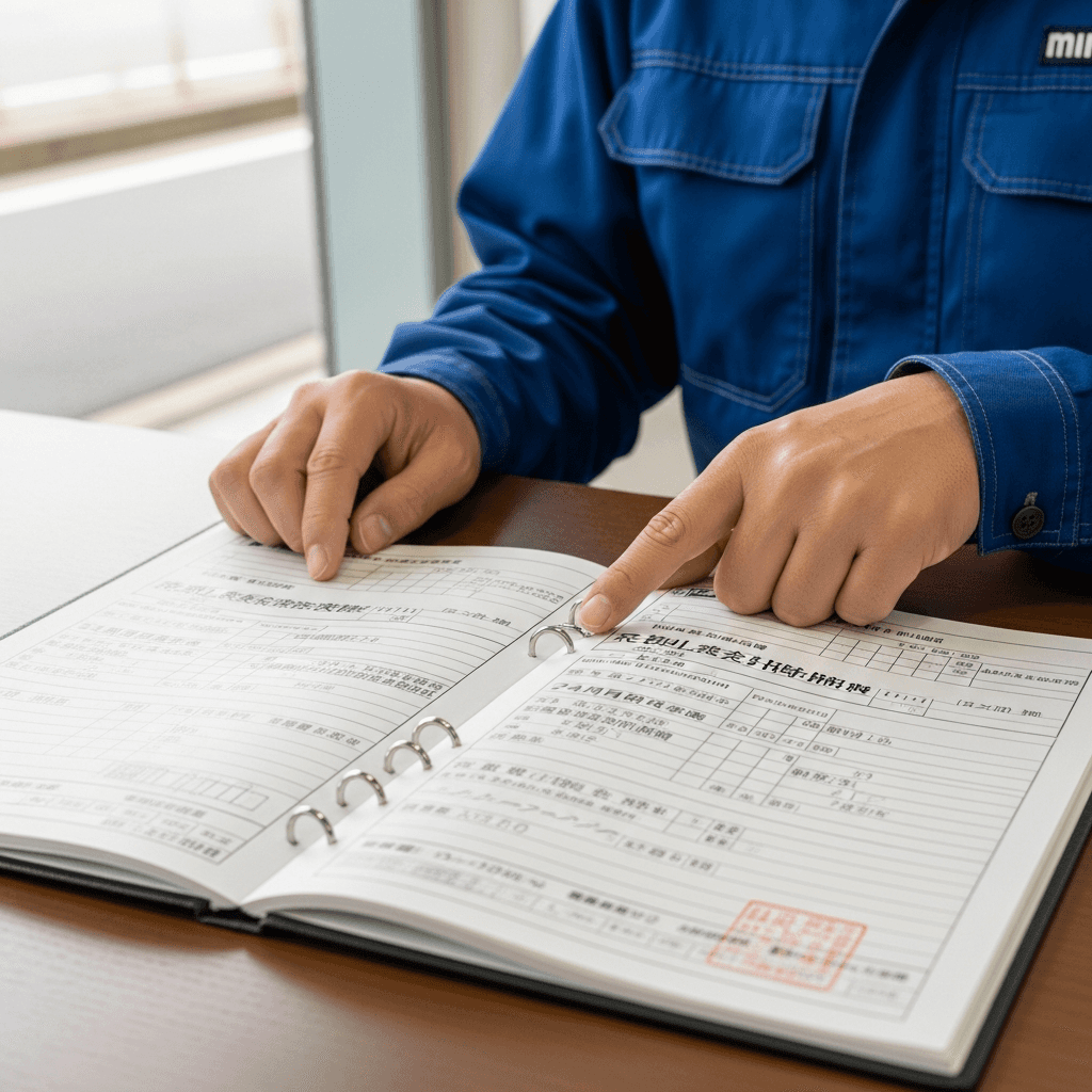 ミニキャブトラックの整備記録簿に定期点検(12ヶ月・24ヶ月)の履歴が全て記載されていれば「管理の行き届いた車」と高評価。特にエンジンオイル交換履歴は重要で+6~9万円の効果。