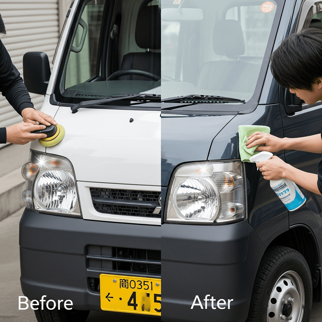 ミニキャブトラックはヘッドライトの黄ばみとボディの鉄粉が第一印象を損ねます。研磨+鉄粉除去クリーナー+ワックスで輝きを取り戻せば「程度良好」と判断され+4~7万円の効果。