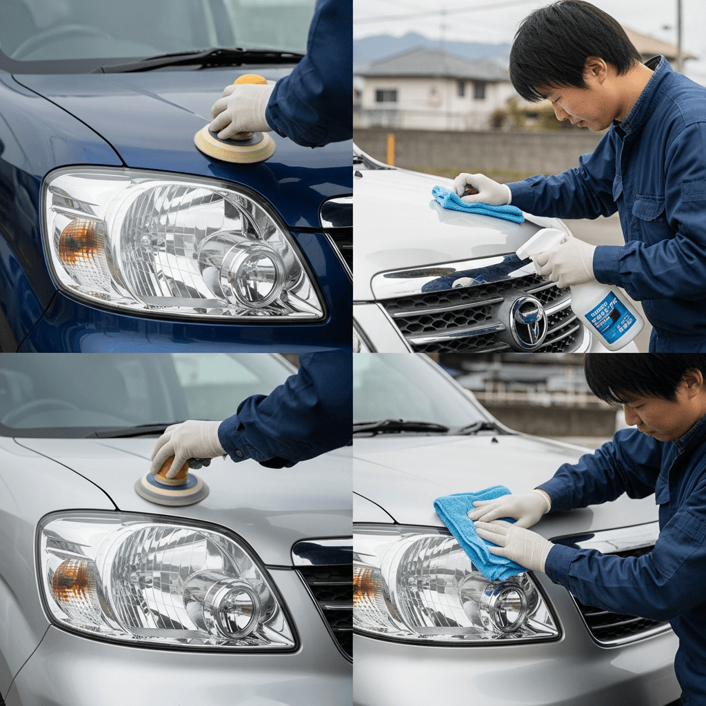 モコはヘッドライトの黄ばみとボディの鉄粉が第一印象を損ねます。研磨+鉄粉除去クリーナー+ワックスで輝きを取り戻せば「程度良好」と判断され+4~7万円の効果。