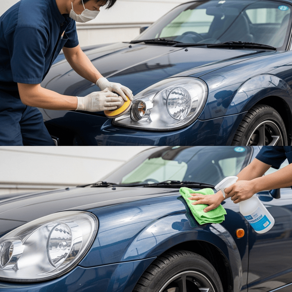 MRスパイダーはヘッドライトの黄ばみとボディの鉄粉が第一印象を損ねます。研磨+鉄粉除去クリーナー+ワックスで輝きを取り戻せば「程度良好」と判断され+4~7万円の効果。