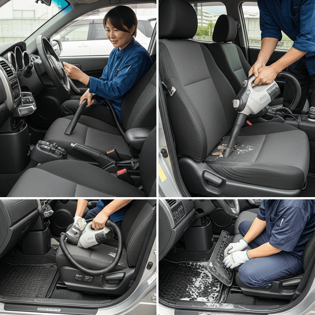 MRワゴンは第一印象が査定の8割を決めます。シート隙間のゴミ除去、マット洗浄、樹脂パーツ艶出しで新車級の清潔感に。特に臭いゼロなら「禁煙車」扱いで+5~8万円UP。